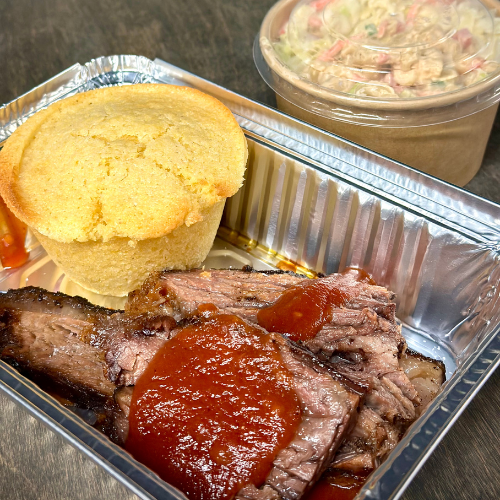 Beef brisket, pulled pork, cornbread. coleslaw, macaroni salad