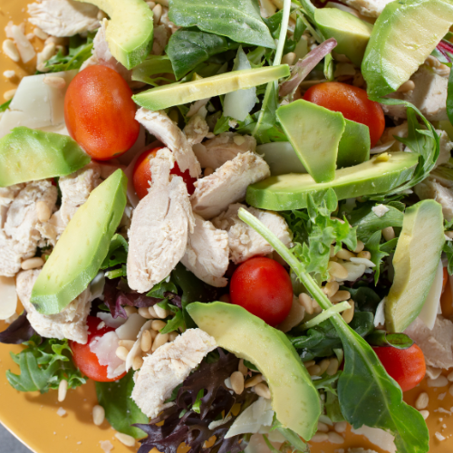 Grilled chicken, tomato, avocado, crispy tortilla, dried cranberry, pumpkin seed, honey lime vinaigrette