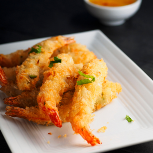 Coconut and panko-crusted, crispy-fried prawns served with sweet chili sauce