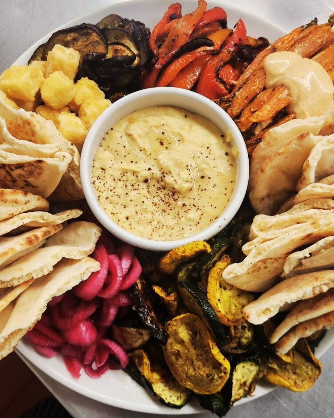 Fire-roasted vegetables. hummus. labneh, crispy feta. pickled vegetables. pita bread