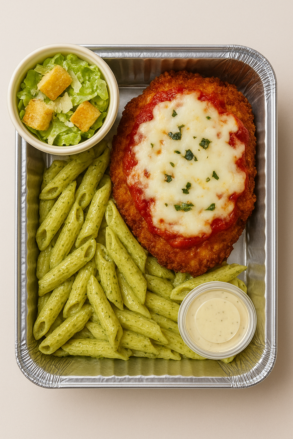 Chicken or eggplant parmigiana, creamy pesto penne, Caesar salad
