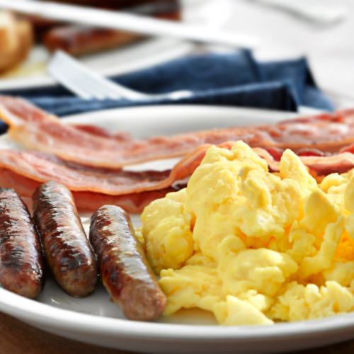 Scrambled egg, bacon, sausage, lyonnaise potato, English muffin and fresh fruit